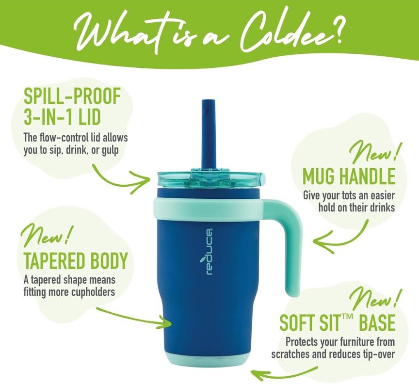 Reduce 14 oz Coldee Tumbler with Handle for Kids, Nautical Mist - Ly cách nhiệt Reduce Coldee được làm bằng thép 18/8 với hình dạng ly thuôn nhọn mới giờ đây phù hợp với nhiều ngăn đựng cốc hơn, cho phép con bạn mang theo bộ đồ uống đi bất cứ đâu, để bổ sung nước khi đang di chuyển. Ly có thiết kế đế mới giúp chống trầy xước và móp méo, ống hút chống tràn & nắp lật chống rò rỉ, điều này cho phép con bạn kiểm soát dòng chảy của đồ uống, để chúng có thể nhấm nháp, uống hoặc hớp đồ uống yêu thích của mình.