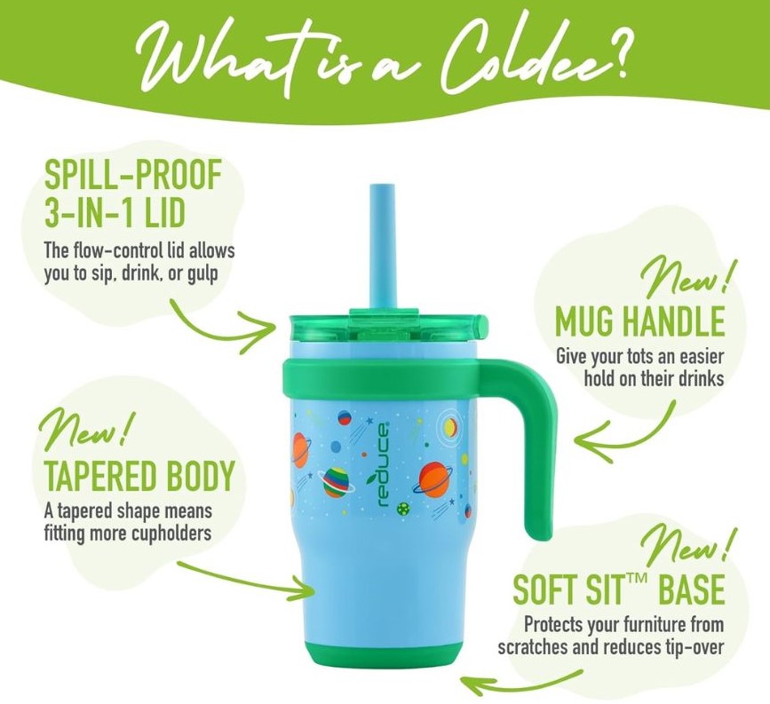 Reduce 14 oz Coldee Tumbler with Handle for Kids, Out of this World - Ly cách nhiệt Reduce Coldee được làm bằng thép 18/8 với hình dạng ly thuôn nhọn mới giờ đây phù hợp với nhiều ngăn đựng cốc hơn, cho phép con bạn mang theo bộ đồ uống đi bất cứ đâu, để bổ sung nước khi đang di chuyển. Ly có thiết kế đế mới giúp chống trầy xước và móp méo, ống hút chống tràn & nắp lật chống rò rỉ, điều này cho phép con bạn kiểm soát dòng chảy của đồ uống, để chúng có thể nhấm nháp, uống hoặc hớp đồ uống yêu thích của mình.