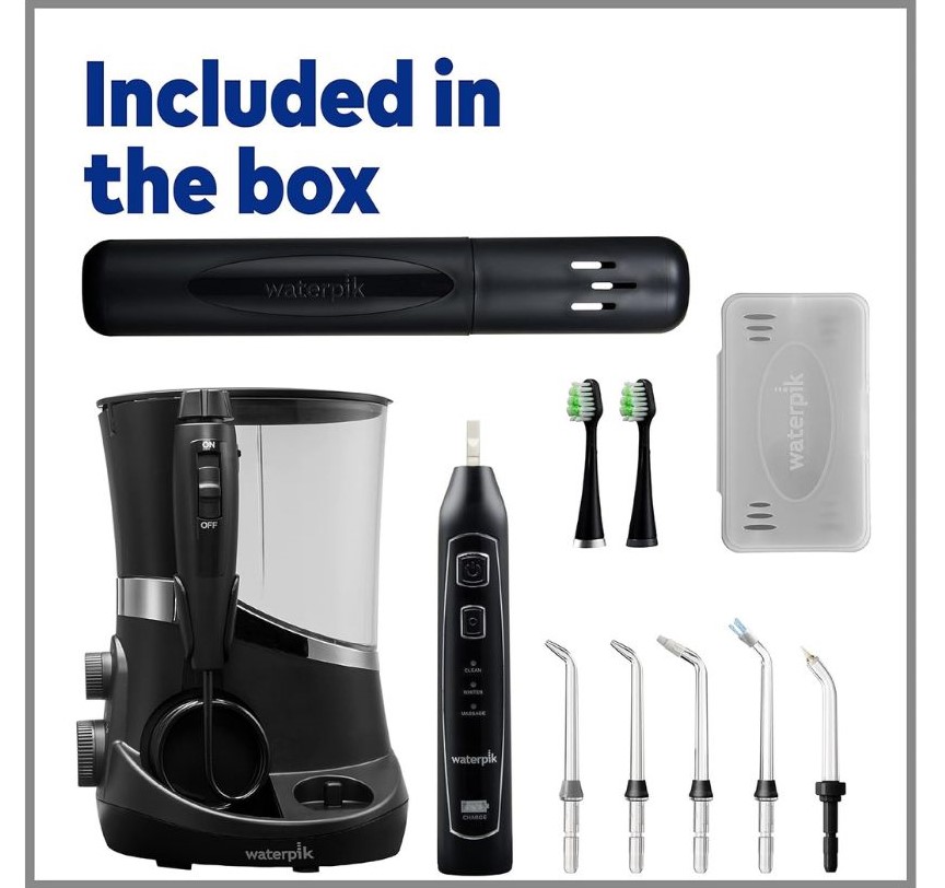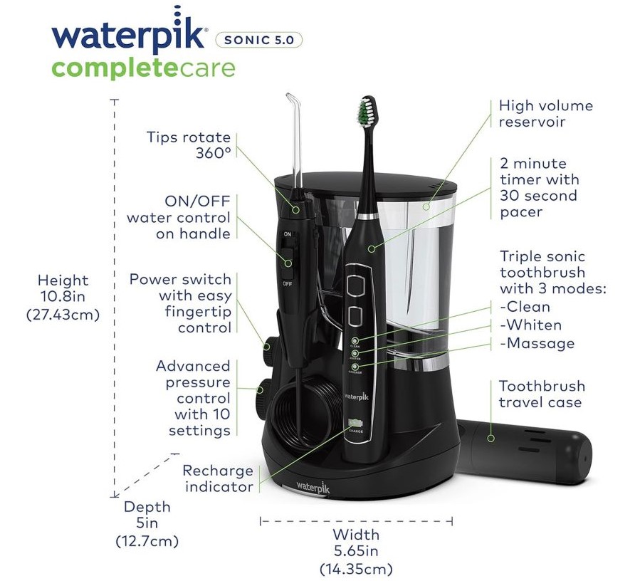 Waterpik Complete Care 5.0 Water Flosser + Sonic Electric Toothbrush, Black WP-862 -Máy tăm nước Waterpik Complete Care 5.0 + Bàn chải đánh răng Sonic WP-861 kết hợp công nghệ tăm nước và bàn chải đánh răng điện siêu âm để tạo nên thói quen chăm sóc răng miệng hàng ngày hoàn hảo. Giờ đây bạn có thể chải răng và dùng chỉ nha khoa bằng một thiết bị tiện lợi giúp tiết kiệm không gian, nó lý tưởng cho bất kỳ ai niềng răng, cấy ghép, mão răng, cầu răng hoặc các công việc nha khoa khác.(A)