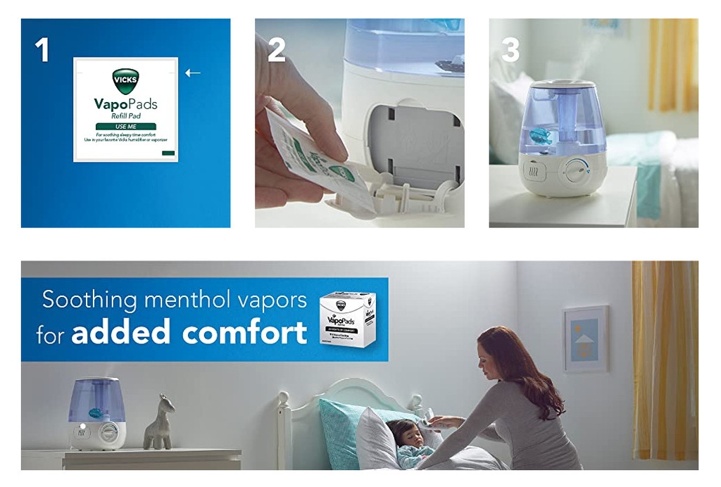 Mỗi tấm lót mang lại sự thoải mái trong 8 giờ với máy xông hơi, ống hít và máy tạo ẩm không cần phích cắm của Vicks, để bạn có thể thở dễ dàng hơn và ngủ ngon hơn