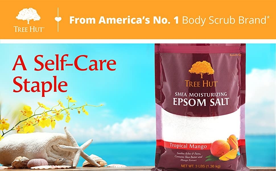 Tree Hut Shea Moisturizing Epsom Salt Tropical Mango - Muối ngâm siêu dưỡng ẩm này được pha chế với Bơ hạt mỡ đã được chứng nhận với Mango Puree để nuôi dưỡng và mang lại cho làn da cảm giác mịn màng. Thư giãn, giải độc và say mê với cách ngâm sâu này để mang lại lợi ích cho bàn chân, bàn tay, chân và toàn bộ cơ thể của bạn. Phục hồi cơ bắp mệt mỏi, đau nhức & để thư giãn cơ thể và tâm trí.