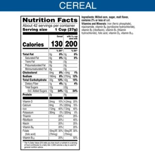 Thành phần: Ngô xay, đường, hương mạch nha, chứa 2% hoặc ít hơn muối. Vitamin và khoáng chất: Sắt (ferric phosphate), niacinamide, vitamin B6 (pyridoxine hydrochloride), vitamin B2 (riboflavin), vitamin B1 (thiamin hydrochloride), axit folic, vitamin D3, vitamin B12. Ngô được sử dụng trong sản phẩm này có chứa một lượng nhỏ đậu nành.