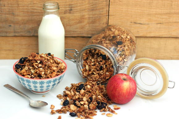 Granola được tạo ra từ yến mạch, lạc, mật ong và gạo là loại ngũ cốc ăn sáng tuyệt vời, rất phổ biến của người Mỹ. Nó chứa hàm lượng cân đối các chất dinh dưỡng và protein cung cấp nguồn năng lượng dồi dào cho ngày mới. Granola được khởi xướng từ nhà dinh dưỡng, bác sĩ Sylvester Graham (1794 – 1851), ông là một tín đồ của phong trào ăn chay. Trong thời điểm hiện nay, Granola được biết đến rộng rãi và phổ biến trên khắp đại cầu, nhất là các nước châu Âu, Mỹ, Úc. Granola được coi như một loại đồ ăn sáng, có thể đem nướng, trộn với nước hoa quả, sữa chua hoặc là món ăn vặt. Bạn có thể yên tâm, tha hồ thưởng thức món ăn này vì nó cung cấp nhiều năng lượng mà không hề gây béo phì.