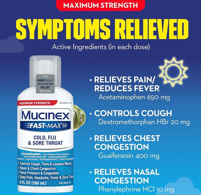 Mucinex Fast-Max Maximum Strength Cold, Flu & Sore Throat Liquid - Siro giảm cảm lạnh, cảm cúm & đau họng Mucinex Fast-Max giúp hạ sốt, giảm ho, đau họng, nghẹt mũi & ngực, nhức đầu và đau nhức nhẹ. Sản phẩm đến từ thương hiệu ho & cảm lạnh số #1 được các bác sĩ tin cậy và là thương hiệu số #1 được dược sĩ khuyên dùng. Sản phẩm chỉ dành cho người lớn và trẻ em từ 12 tuổi trở lên.
