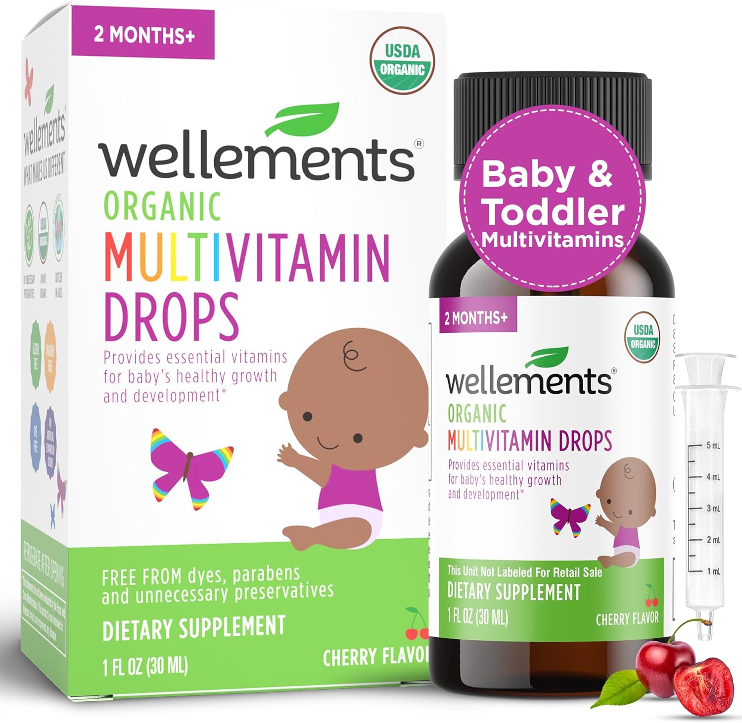 Wellements Organic Baby Multivitamin Drops - Vitamin tổng hợp dạng giọt hữu cơ cho bé của chúng tôi cung cấp liều vitamin thiết yếu hàng ngày, bao gồm A, B, C, D và E. Loại vitamin tổng hợp dạng lỏng này dành cho trẻ mới biết đi hỗ trợ hệ miễn dịch, tăng trưởng và phát triển xương khỏe mạnh.