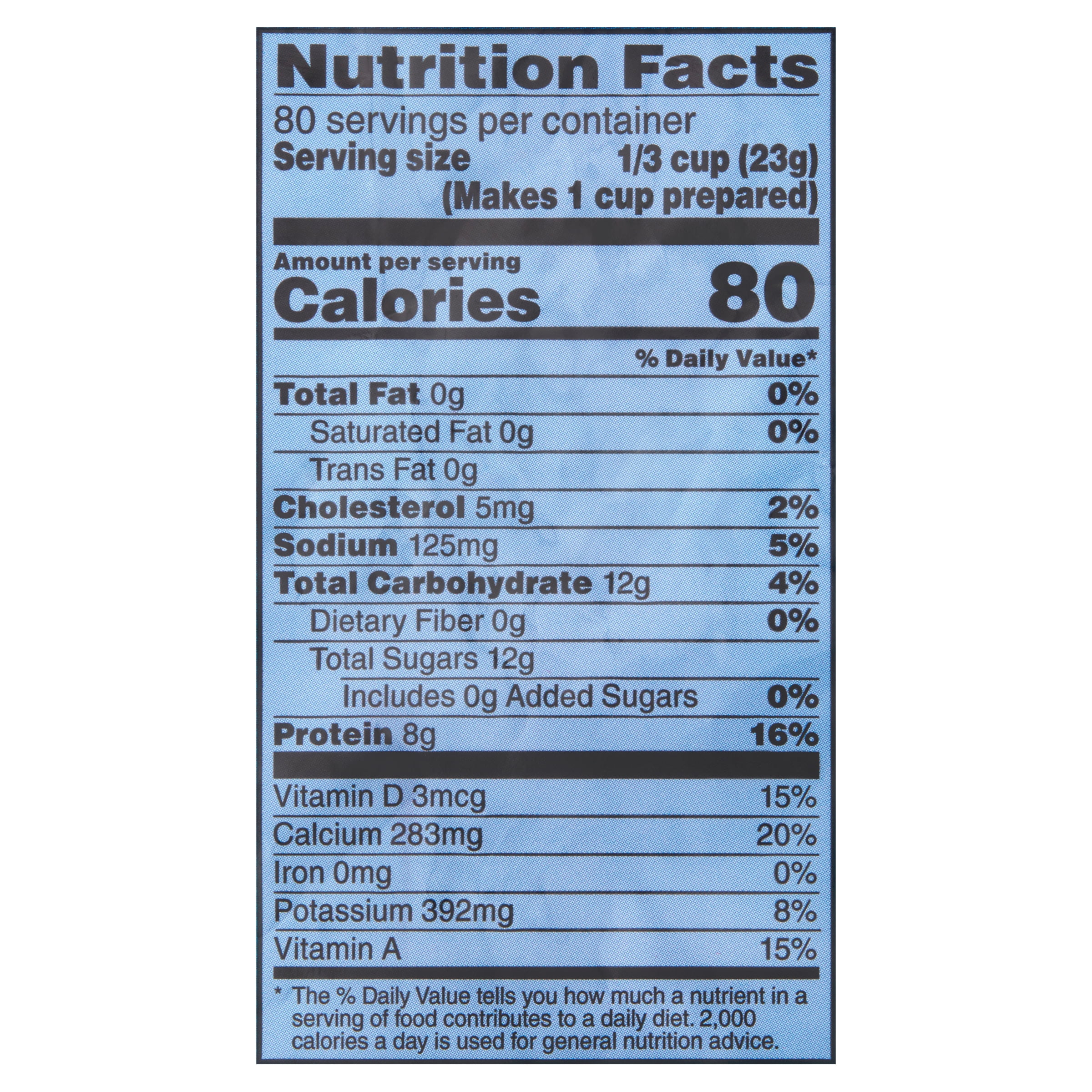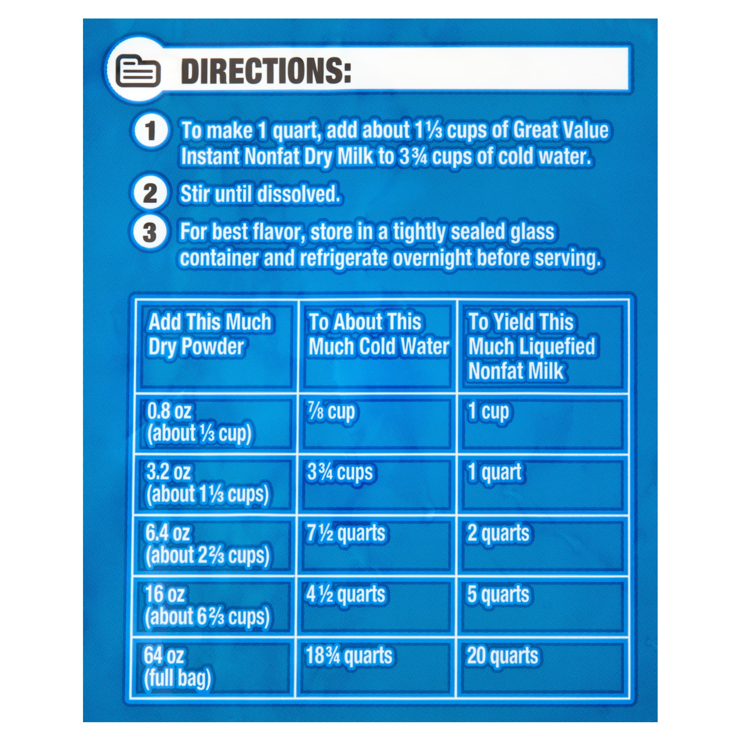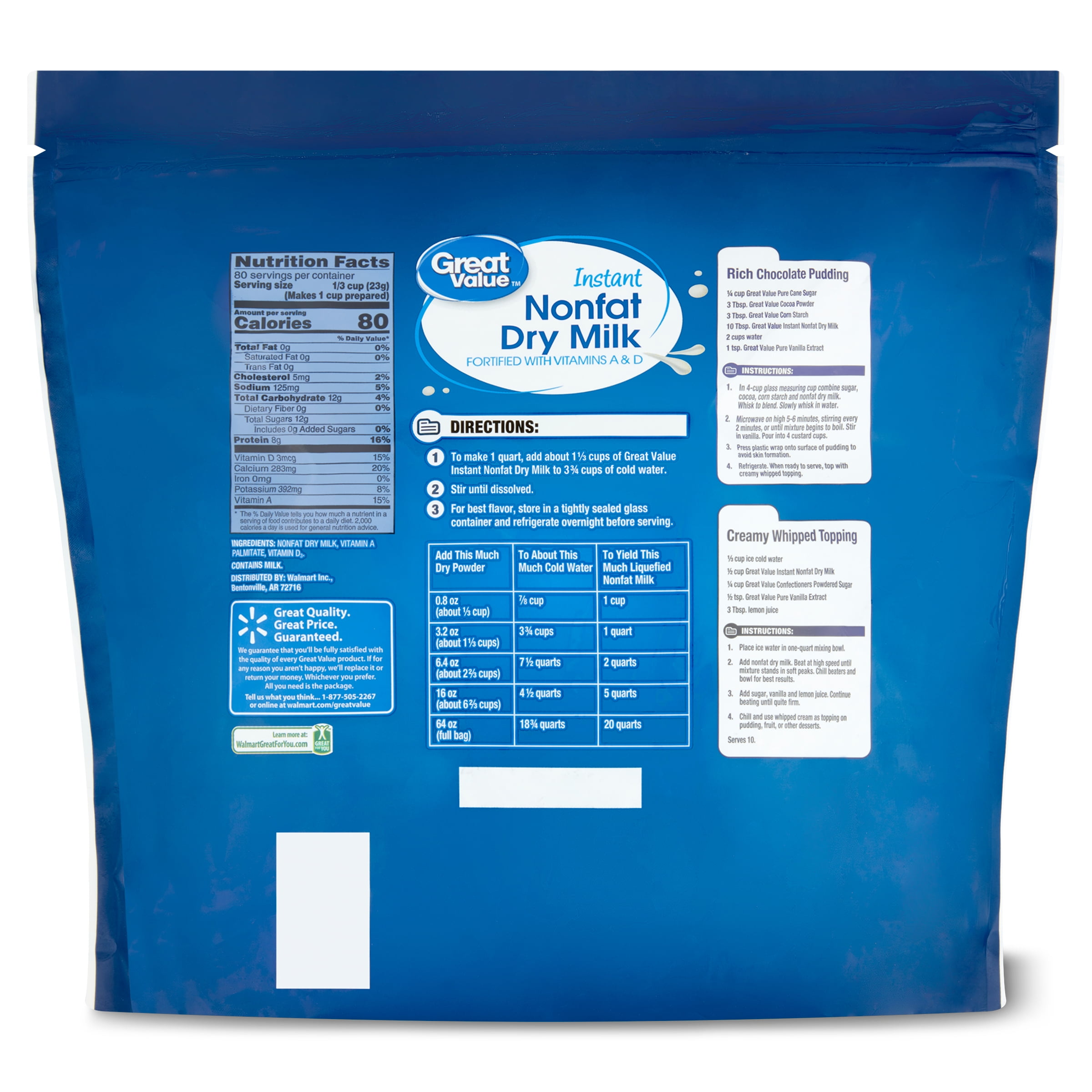 Sữa khô của Great Value bổ sung chất dinh dưỡng và kết cấu kem cho các công thức nấu ăn yêu thích của bạn mà không cần thêm chất béo. Nó rất tuyệt vời trong sinh tố, cà phê, bánh nướng, các món mặn và tạo ra một chiếc bánh pudding sô cô la dày không béo thơm ngon và lớp phủ kem đánh bông. Sữa khô không béo ăn liền giá trị tuyệt vời đi từ trang trại đến bàn của bạn như một ly sữa tươi hoặc một chất bổ sung dinh dưỡng cho tất cả các món ăn và nướng bánh của bạn. Sữa khô không béo hòa tan tuyệt vời, túi 64 oz, tạo ra 20 lít và chứa 80 khẩu phần mỗi hộp.