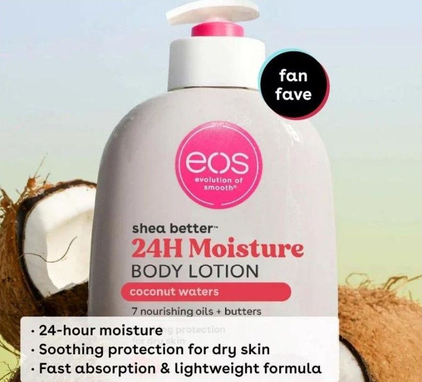 eos Shea Better Body Lotion- Coconut Waters, Soothes Dry Skin - Sữa dưỡng thể eos Coconut Waters ấm áp và ngập nắng sẽ đưa bạn đến những nơi kỳ lạ nhất và những bãi biển cát trắng với hương dừa kem hòa quyện với hoa dâm bụt tươi tốt và mùi hương xạ hương tinh tế. Sữa dưỡng thể eos 24h với có công thức chứa dầu hạt mỡ + bơ hạt mỡ giúp dưỡng ẩm tức thì hấp thụ nhanh chóng để tăng cường độ ẩm suốt ngày đêm, mang lại làn da dưỡng ẩm sang trọng, mịn màng như lụa.