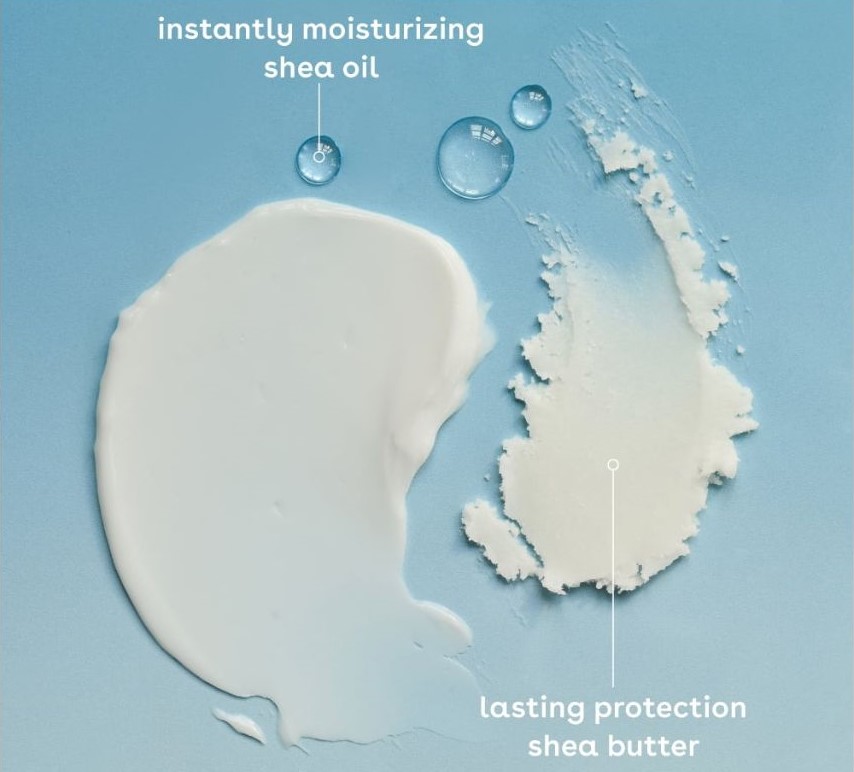Nước/eau, glycerin, isopropyl pa;mitate, cetyl ethylhexanoate, glyceryl stearate SE, rượu cetyl, dimethicon, hương liệu/parfum, bơ butyrospermum parkii (shea), dầu butyrospermum parkii (shea), Petrolatum, dầu khoáng (huile minérale), carbomer, caprylyl glycol, hexylene glycol, phenoxyetanol, axit palmitic, axit stearic, axit myristic, disodium EDTA, natri hydroxit, tocopheryl axetat, axit citric, benzyl salicylate, coumarin.