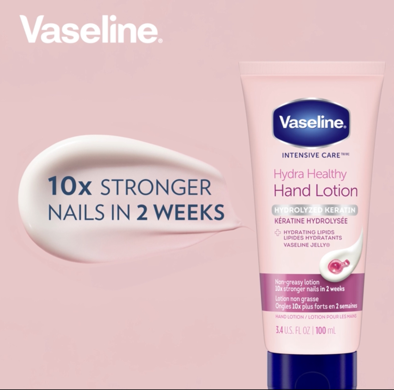 Vaseline Intensive Care Healthy Hands Stronger Nails Lotion - Da tay của chúng ta thường là nơi đầu tiên bị khô, chịu tác động từ nhiệt độ khắc nghiệt, độ ẩm thấp và chất tẩy rửa mạnh làm bong tróc lớp hàng rào tự nhiên của da. Khi tiếp xúc hàng ngày với các tác nhân gây kích ứng từ môi trường (như gió, thiếu độ ẩm và ánh nắng mặt trời), lớp hàng rào độ ẩm tự nhiên của da có thể bị phá vỡ, khiến nước thoát ra khỏi da.(T)