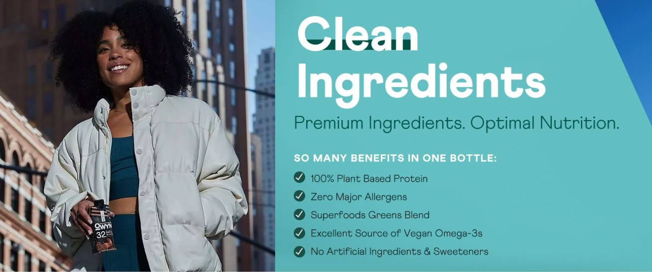 Thành phần: Nước, hỗn hợp protein Owyn (protein đậu, protein hạt bí ngô hữu cơ, dầu hạt lanh), hỗn hợp Gallen Gum/Acacia Gum, chất xơ hòa tan, bột ca cao, dầu hướng dương, lecithin hướng dương, guar gum, chiết xuất quả la hán, muối biển hồng Himalaya, hương sô cô la tự nhiên (hương vị tự nhiên, ca cao đen) hỗn hợp rau xanh (rau bina, cải xoăn, bông cải xanh).