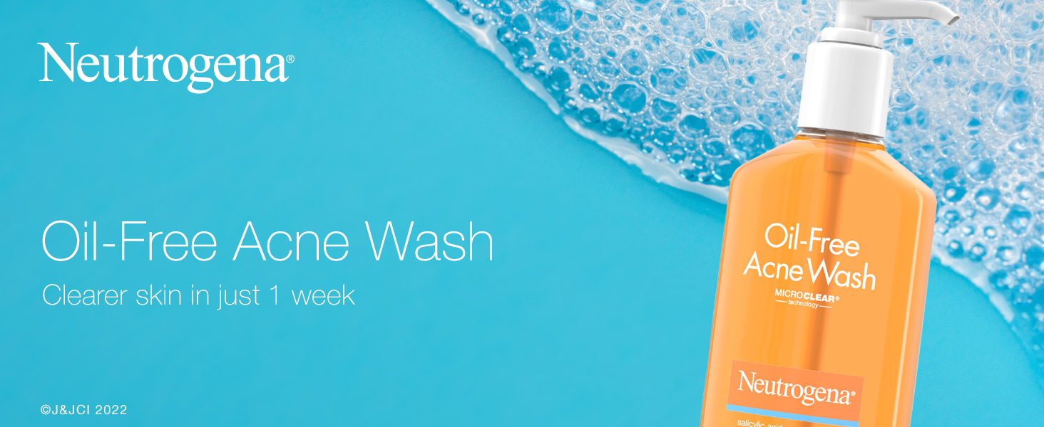 CLEANSE: Sau khi tẩy trang, sử dụng Neutrogena Oil-Free Acne Wash để làm sạch da khỏi bụi bẩn và dầu tích tụ theo thời gian.