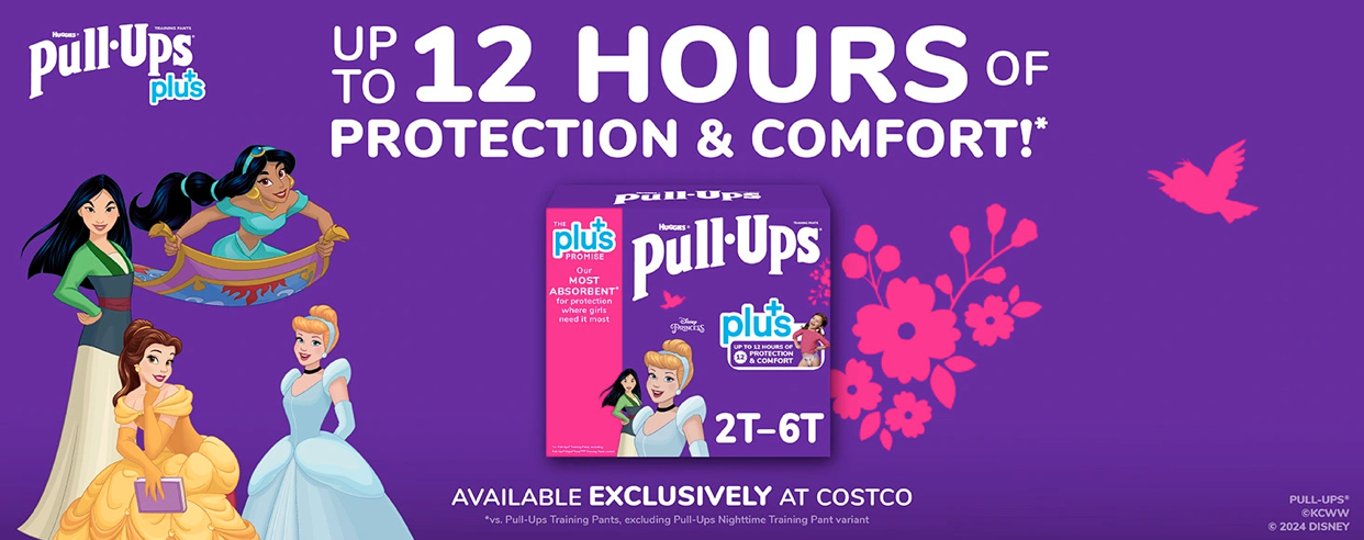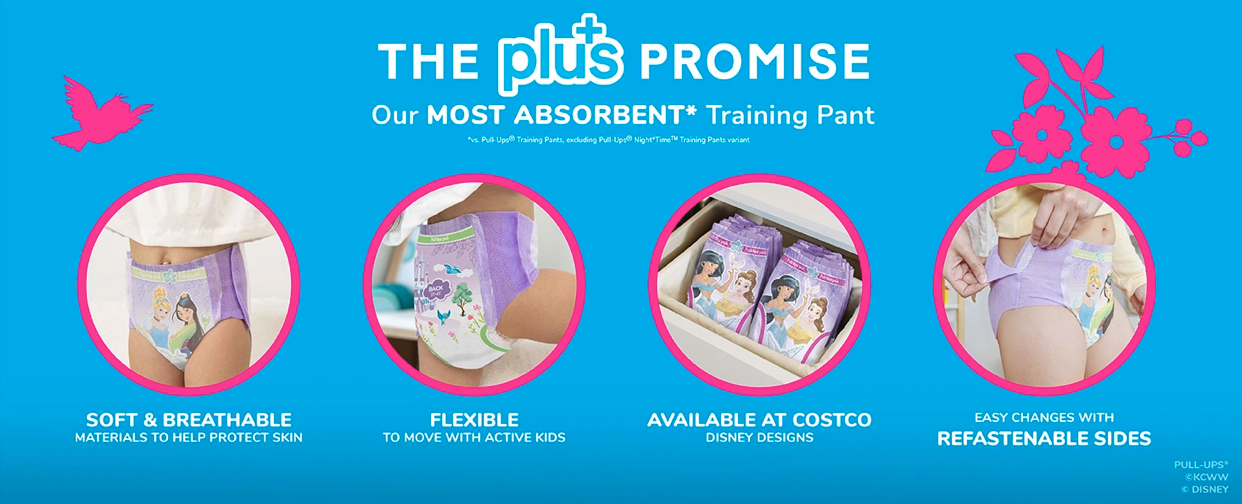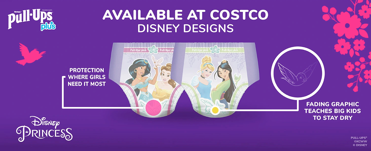Chúng cũng có các mặt có thể cài lại để dễ dàng thay đồ và vừa vặn có thể điều chỉnh. Với các mặt có thể cài lại này, việc thay đồ trở nên thuận tiện mà không cần cởi bỏ quần áo! Quần tập đi vệ sinh Pull-Ups Plus dành cho bé gái có thiết kế độc quyền với hình ảnh công chúa Disney, chỉ có tại Costco. Hình ảnh sẽ mờ dần khi ướt, giúp dạy con bạn cách giữ khô ráo. Khi con bạn đã sẵn sàng bắt đầu hành trình tập đi vệ sinh, thương hiệu Pull-Ups có thể giúp bạn.