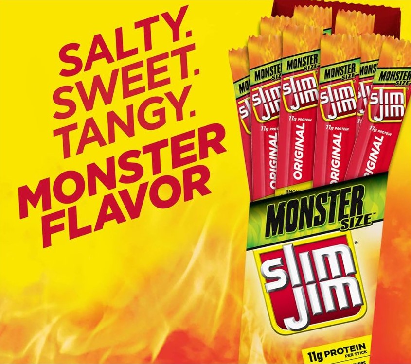 Slim Jim Monster Original - Thanh thịt hun khói Slim Jim được làm từ sự kết hợp của thịt bò, thịt lợn và thịt gà cay, món ăn thơm ngon này có thể trở thành món ăn yêu thích trong gia đình bạn. Sản phẩm được đóng gói riêng tiện lợi, bạn có thể dễ dàng cho vào túi khi di chuyển, hay tại nơi làm việc, thư viện hoặc phòng tập thể dục có thể giúp bạn tiếp thêm năng lượng và tập trung lại, giúp bạn vượt qua cơn đói cả ngày.(C,S)