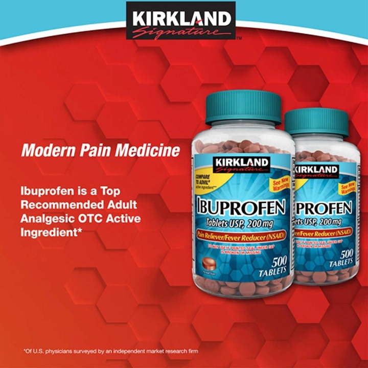 Kirkland Signature Ibuprofen, 200 mg là một loại thuốc kháng viêm không steroid (NSAID). Kirkland Signature Ibuprofen Tablets USP 200 mg là một loại thuốc để giảm tạm thời các cơn đau và nhức nhẹ, không chứa gluten.