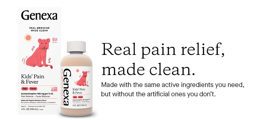 Genexa Kid's Pain & Fever là thuốc thật, được sản xuất sạch - giúp giảm tạm thời một loạt các triệu chứng cảm lạnh và cúm, bao gồm đau nhức nhẹ, đau đầu và đau họng. Hỗn dịch uống này có cùng thành phần hoạt chất bạn cần (acetaminophen), nhưng không có thành phần nhân tạo mà bạn không cần (thuốc nhuộm, chất gây dị ứng thông thường, paraben). Chúng tôi chỉ sử dụng những nguyên liệu mà mọi người xứng đáng để làm ra những loại thuốc thuần chay được chứng nhận không chứa gluten, không biến đổi gen đầu tiên để giúp những đứa trẻ nhỏ của bạn cảm thấy tốt hơn.