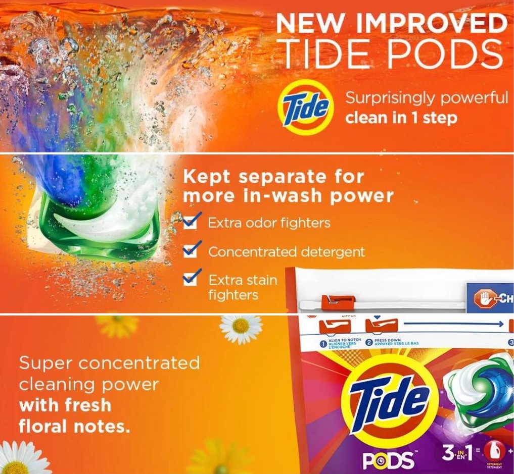 Viên giặt Tide Pods nhỏ nhưng có tác dụng mạnh mẽ, chỉ trong một viên giặt nhỏ có thiết kế ba ngăn cải tiến giúp tách các thành phần chính cho đến khi chúng được giặt để có khả năng làm sạch tối đa. Những viên giặt được cải tiến này còn cho thấy khả năng giặt sạch nhất của Tide với lớp màng đặc biệt cho phép công nghệ nhiều ngăn hòa tan trong cả nước nóng và nước lạnh.