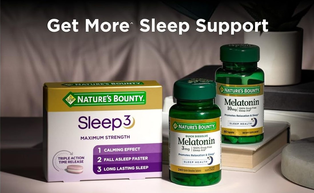 Các sản phẩm hỗ trợ giấc ngủ cải tiến của Nature's Bounty bao gồm Nature's Bounty Dual Spectrum Melatonin, chứa cả lớp giải phóng nhanh và giải phóng kéo dài hỗ trợ giấc ngủ ngon cho đến sáng. Nature's Bounty Sleep3 có hoa cúc, hoa oải hương, dầu chanh và rễ cây nữ lang cùng với 10mg Melatonin giúp bạn thư giãn, ngủ nhanh hơn và ngủ lâu hơn. Và Viên ngậm Melatonin hòa tan nhanh của Nature's Bounty cung cấp một cách dễ dàng hơn để hỗ trợ giấc ngủ nếu bạn gặp khó khăn khi nuốt thuốc ngủ.