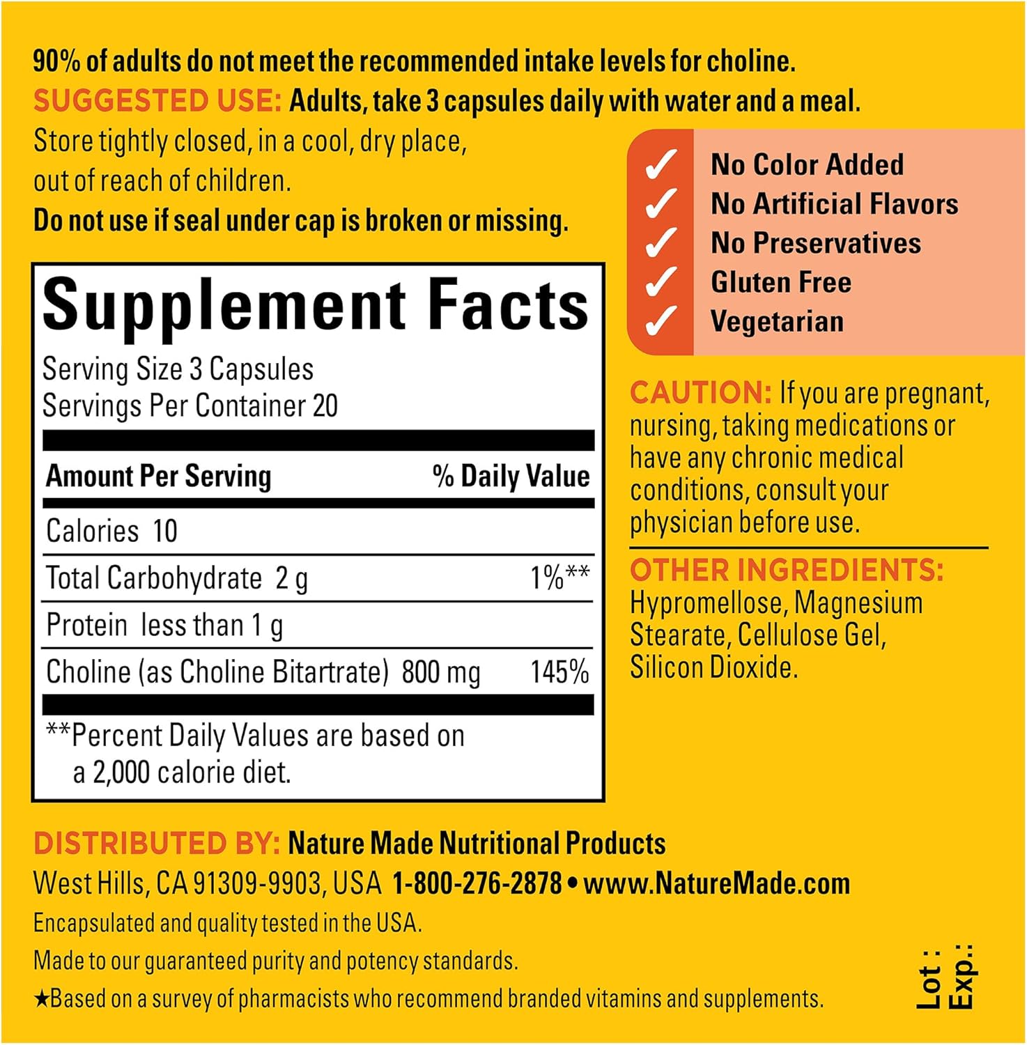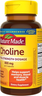 Người lớn, uống 3 viên nang mỗi ngày với nước và bữa ăn. Bắt đầu ngày mới của bạn với thực phẩm bổ sung Choline từ Nature Made. (1) Ở người trẻ tuổi (2) Choline giúp tạo ra acetylcholine để hỗ trợ trí nhớ, tâm trạng và sức khỏe cơ bắp.