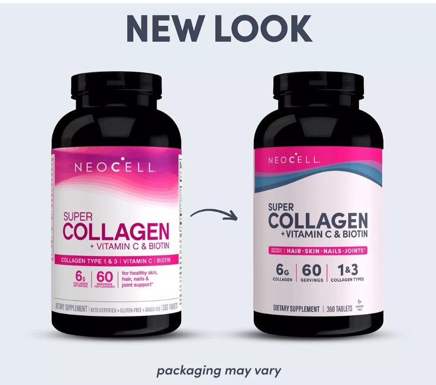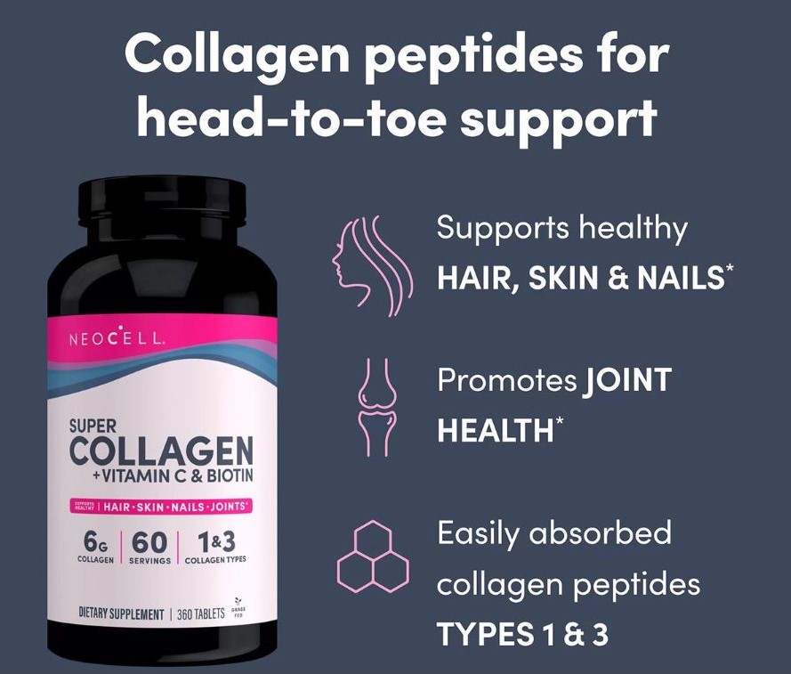 NeoCell Super Collagen + Vitamin C & Biotin Tablets - Viên uống bổ sung NeoCell Super Collagen+ Vitamin C & Biotin là thực phẩm bổ sung chống lão hóa giúp thúc đẩy mái tóc bóng mượt, làn da trẻ trung và móng tay chắc khỏe. Khi bạn già đi, việc sản xuất collagen chậm lại một cách tự nhiên là điều bình thường, điều này có thể có tác động tiêu cực đến làn da của bạn, gây ra nếp nhăn và đường nhăn. Nhưng với NeoCell Super Collagen+, bạn có thể giúp bù đắp những tác động này và giữ cho làn da của bạn trông khỏe mạnh và trẻ trung.