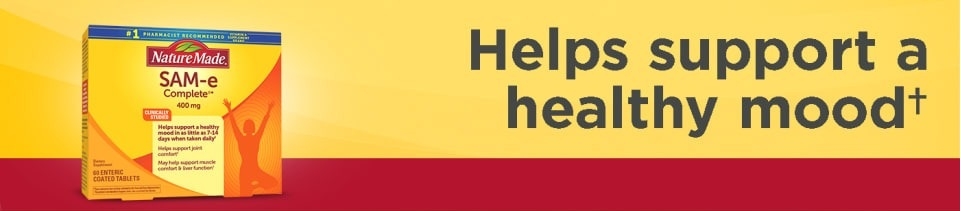 Nature Made SAM-e Complete 400 mg có thể giúp bổ sung mức SAM-e của bạn và giúp hỗ trợ tâm trạng khỏe mạnh. Nature Made là thương hiệu thực phẩm bổ sung SAM-e bán chạy số 1. Nó được hỗ trợ bởi đảm bảo sự hài lòng của chúng tôi và bạn sẽ nhận lại được tiền của mình nếu bạn thấy rằng nó không phù hợp với bạn.