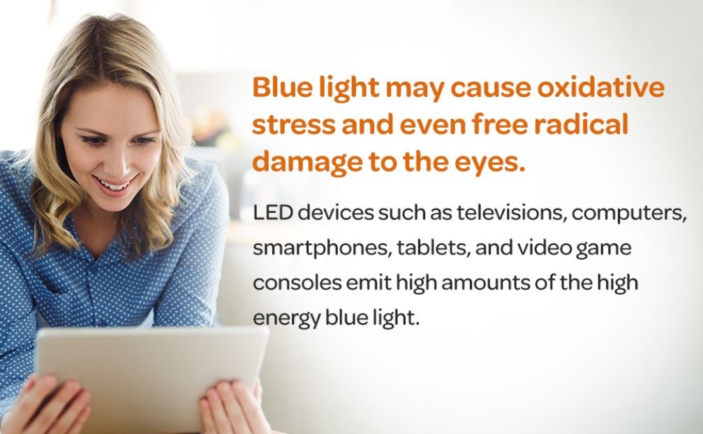 Ánh sáng xanh: Có thể gây ra stress oxy hóa và thậm chí gây tổn thương gốc tự do cho mắt. Các thiết bị LED như tivi, máy tính, điện thoại thông minh, máy tính bảng và máy chơi game video phát ra lượng ánh sáng xanh năng lượng cao.