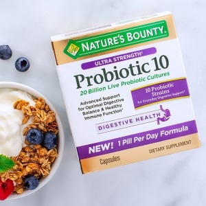 Nature’s Bounty Ultra Strength Probiotic 10 là chế phẩm sinh học dùng một ngày chứa 10 sợi lợi khuẩn độc đáo và hơn 20 tỷ nền văn hóa sống tích cực để giúp hỗ trợ nâng cao sức khỏe hệ tiêu hóa, miễn dịch và hô hấp trên của bạn. Có thể bạn không biết rằng việc hỗ trợ chức năng lành mạnh của các mô lót trong ruột có liên quan trực tiếp đến sức khỏe của hệ thống miễn dịch của bạn. Ultra Strength Probiotic 10 được hỗ trợ bởi 20 năm nghiên cứu lâm sàng và được tạo ra để hỗ trợ sự đa dạng tự nhiên của hệ vi sinh vật của bạn