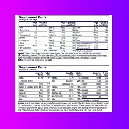 Thành phần: Canxi Carbonate, Dầu cá Omega-3, Gelatin, Glycerin, Magiê Oxit, Sáp ong vàng, Axit ascoricic, Beta-Carotene, Biotin, Sắt carbonyl, Cupric Oxide, d-Alpha Tocopherol, D-Canxi Pantothenate, FD&C Blue , Niacinamide, Kali Iodide, Nước tinh khiết, Pyridoxine Hydrochloride, Riboflavin, Lecithin đậu nành, Thiamine Mononitrate, Titanium Dioxide (màu), Vitamin A Palmitate, Vitamin B12, Vitamin D3 (Cholecalciferol), Zinc Oxide. Chứa: Cá (cá cơm, cá thu, cá mòi, cá ngừ) và đậu nành. Canxi cacbonat, Ôxít magiê, Cellulose vi tinh thể, dl-Alpha-Tocopheryl Acetate, Axit ascoricic, Maltodextrin, Tinh bột thực phẩm biến đổi, Tinh bột ngô; Ít hơn 2%: Beta-Carotene, Biotin, Cholecalciferol, Chromium Chloride, Croscarmellose Natri, Cupric Oxide, Cyanocobalamin, D-Canxi Pantothenate, FD&C Blue #2 Aluminium Lake, FD&C Yellow , Aluminium Lake, FD&C Yellow.