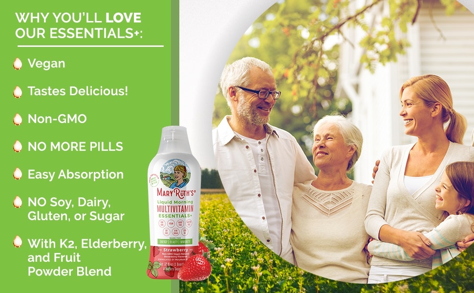 MaryRuth's Liquid Morning Multivitamin Essentials+ là một loại vitamin tổng hợp sử dụng buổi sáng dễ hấp thụ và sẵn có sinh học, được tạo ra để hỗ trợ sự trao đổi chất, hệ thống miễn dịch và sức khỏe tổng thể của cơ thể bạn. Vitamin A hỗ trợ sửa chữa mô và xương, trong khi Vitamin C hỗ trợ sự phát triển của cơ bắp, mô liên kết và da khỏe mạnh, đồng thời chống lại nhiễm trùng. Vitamin D3 có tác dụng giúp hình thành xương và răng, hỗ trợ cơ thể hấp thụ khoáng chất, trong khi Vitamin E tăng cường hệ thống miễn dịch của bạn. K2 hoạt tính sinh học cao (Menaquinone-7) rất cần thiết cho xương chắc khỏe, giúp canxi và các khoáng chất khác liên kết vào chất nền xương. Sự hấp thụ canxi thích hợp làm giảm quá trình canxi hóa, hỗ trợ sức khỏe tim mạch. Vitamin B rất cần thiết cho quá trình trao đổi chất, mức năng lượng, cũng như hệ thần kinh. Hỗn hợp trái cây hữu cơ chống oxy hóa (với Elderberry!) Sẽ giúp loại bỏ các gốc tự do đồng thời hỗ trợ hệ thống miễn dịch của bạn, trong khi hỗn hợp chống viêm và sửa chữa hỗ trợ sửa chữa và bảo dưỡng cơ thể của bạn. Những công thức này được thiết kế để hấp thụ và đồng hóa tối đa để đảm bảo rằng cơ thể bạn nhận được các yếu tố thiết yếu cần thiết.