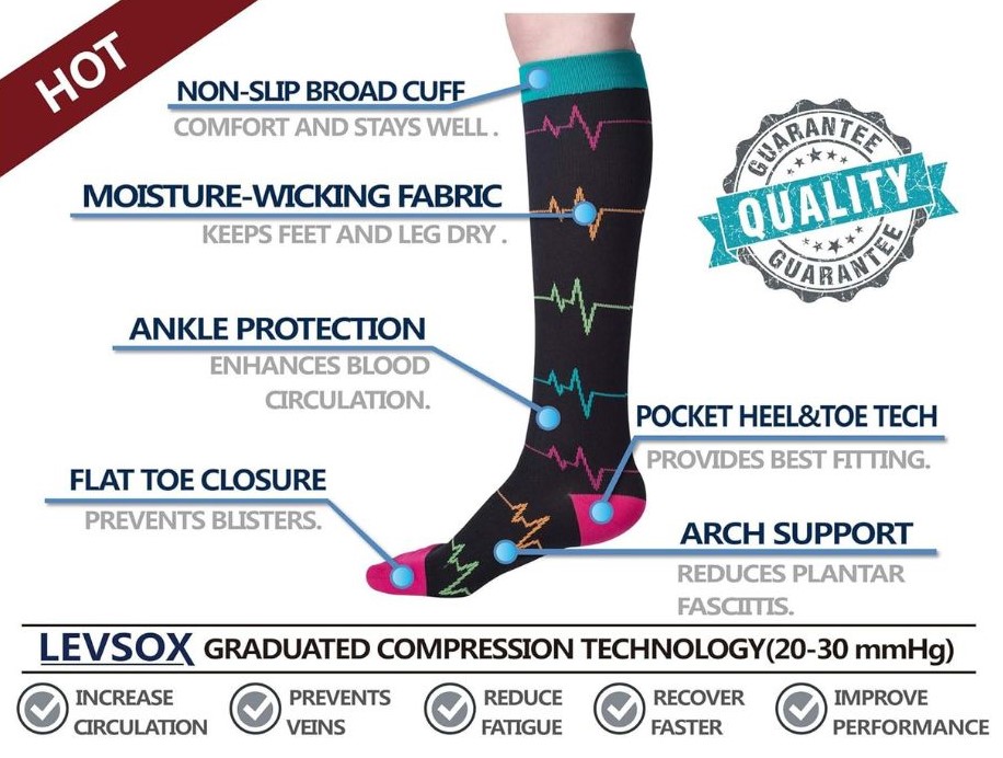 Vớ nén tốt nhất cho nữ và nam - Hỗ trợ nén được đặt hoàn hảo ở nơi cần thiết, vùng ngón chân có một túi được chế tạo đặc biệt, sẽ không bóp vào các khớp ngón chân. Với đặc tính hút ẩm để tăng thêm sự thoải mái, sau 24h chân không thấy nặng nề, không bị sưng tấy. Vớ nén Levsox có chất lượng, dễ chăm sóc và giặt sạch mà không bị mất độ nén, tuổi thọ cao hơn.
